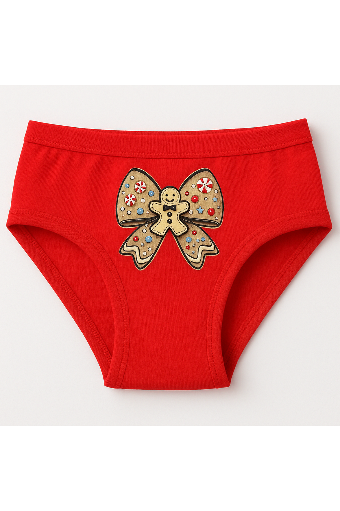 Design: slip rosso rifinito con fascia al girovita e girogamba, stampa gingerbread sul davanti