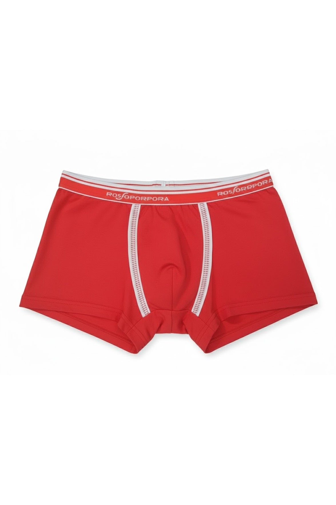 Design: boxer rosso con bordi bianchi e cuciture rosse a contrasto, elastico esterno logato con righe bianche