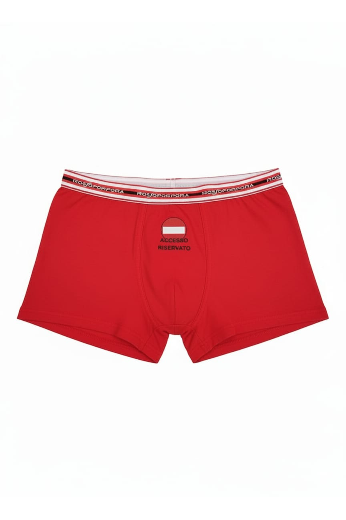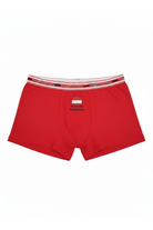Design: boxer rosso con stampa frontale, bordi rossi ed elastico esterno logato con righe bianche e nere