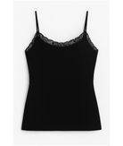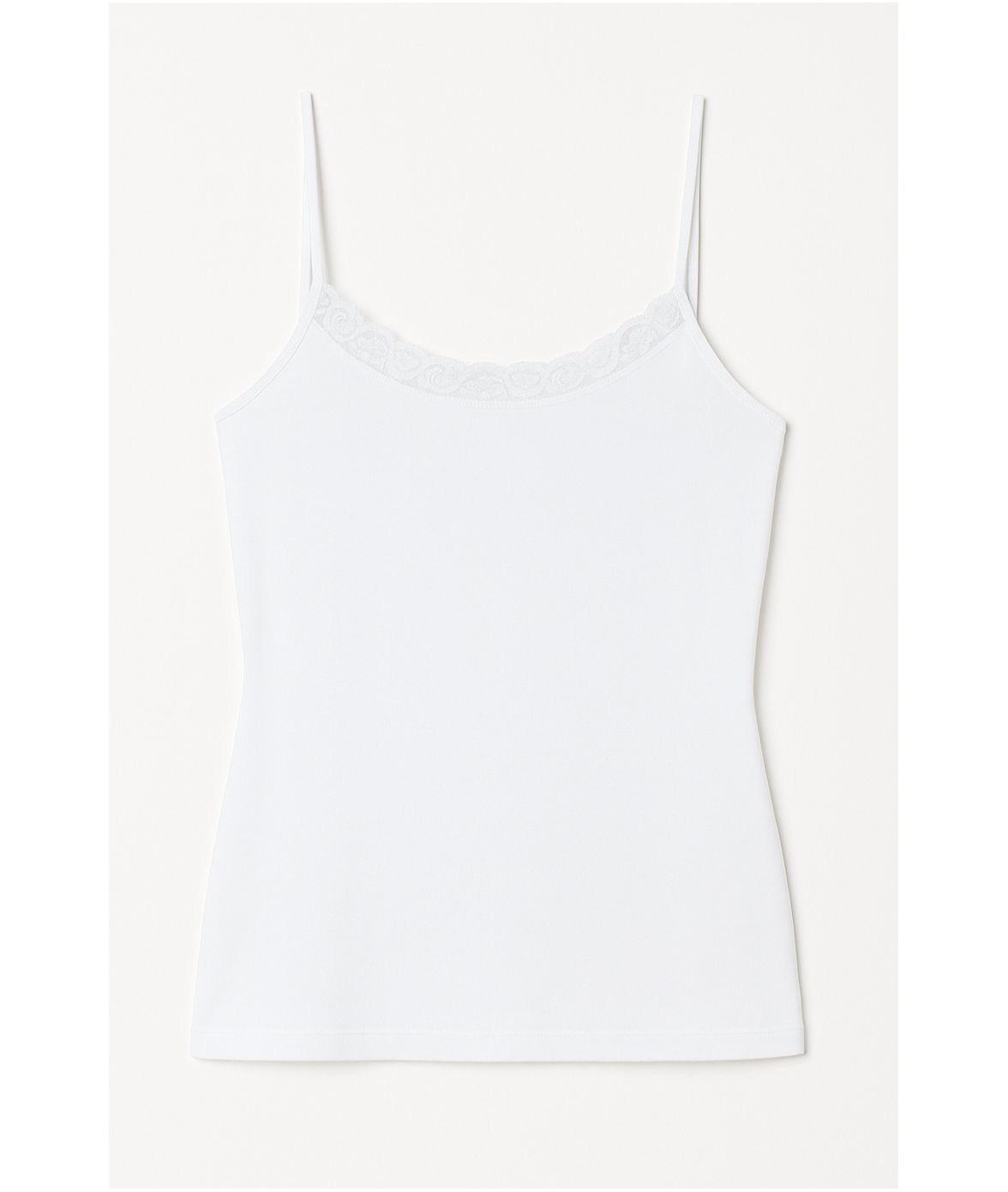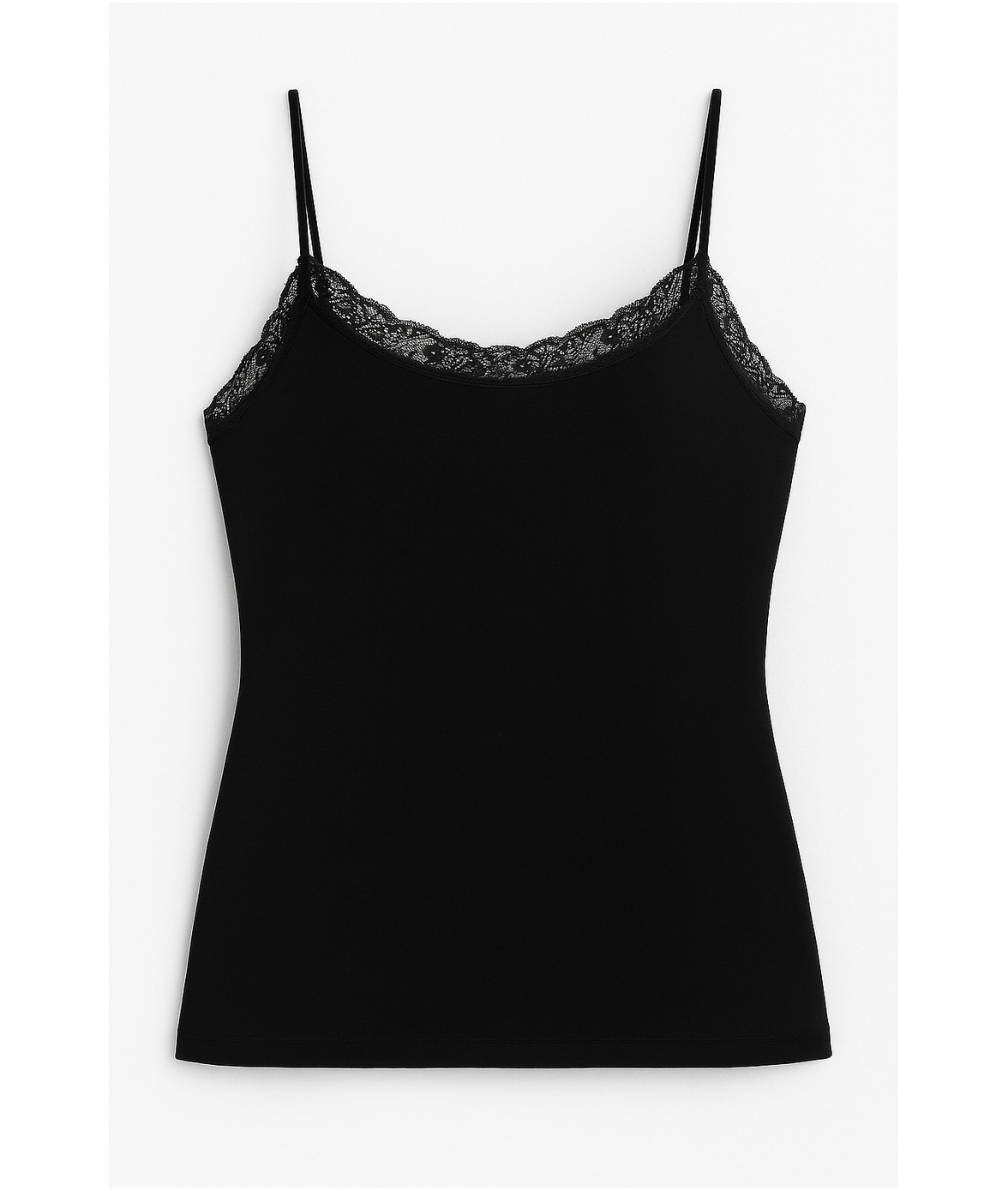 Il design a spalla stretta è arricchito da un delicato inserto in pizzo sul décolleté, che aggiunge un tocco di femminilità e ricercatezza. Versatile e sofisticata, può essere indossata come intimo elegante oppure come top sotto giacche e cardigan, adattandosi facilmente a look casual o più raffinati.