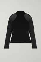 Il tessuto in modal cashmere avvolge la figura con morbidezza e calore, mentre le maniche in tulle aggiungono leggerezza e femminilità. Il collo lupetto completa il design con un tocco sobrio e sofisticato.