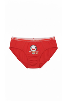 Design: slip rosso con bordi rossi, elastico esterno logato con righe bianche e stampa natalizia ironica