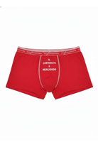 Design: boxer rosso con stampa frontale, bordi rossi e cuciture bianche a contrasto, elastico esterno logato con righe bianche