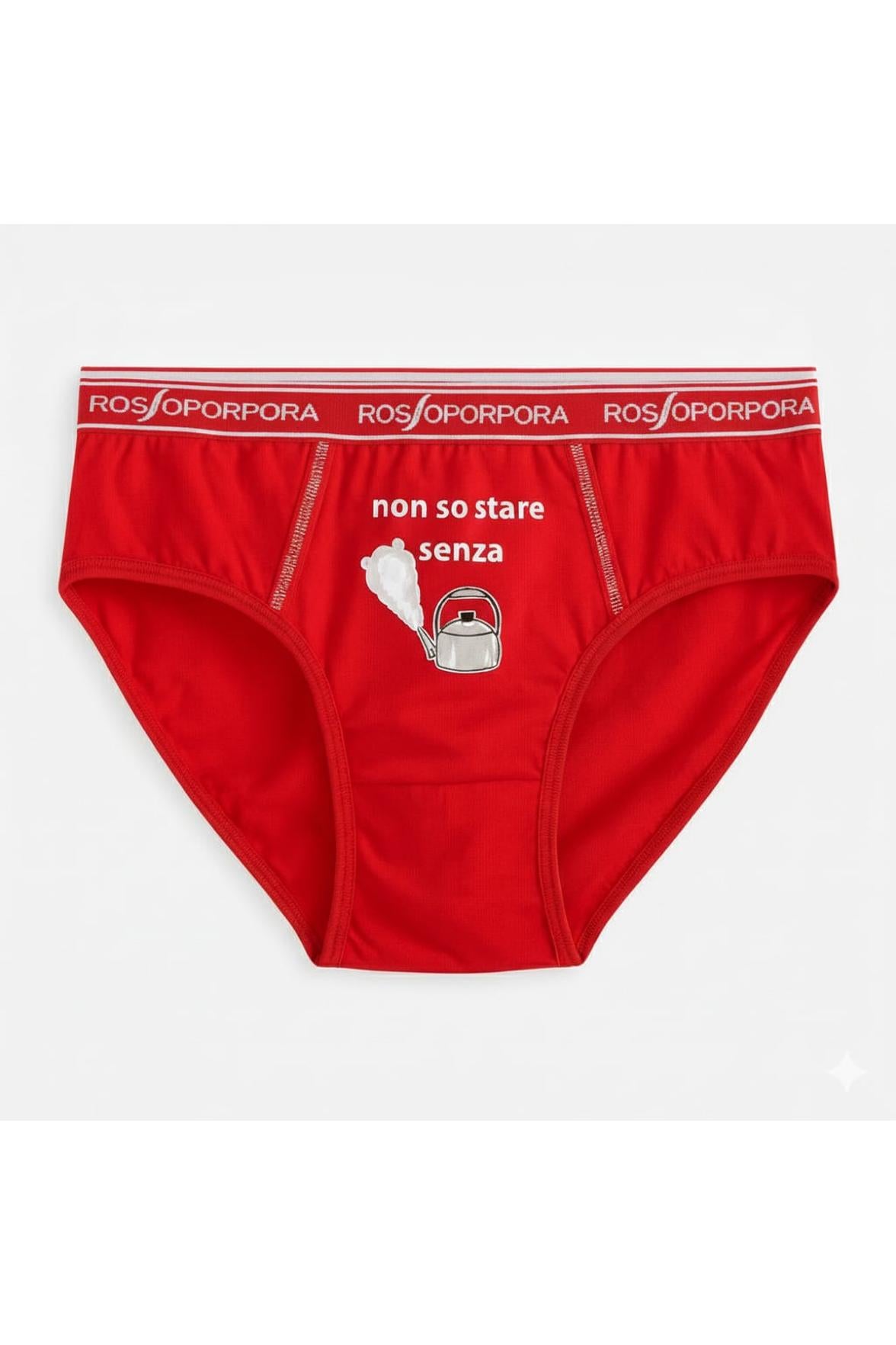 Design: slip rosso con stampa frontale, bordi rossi e cuciture bianche a contrasto, elastico esterno logato con righe bianche