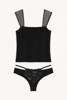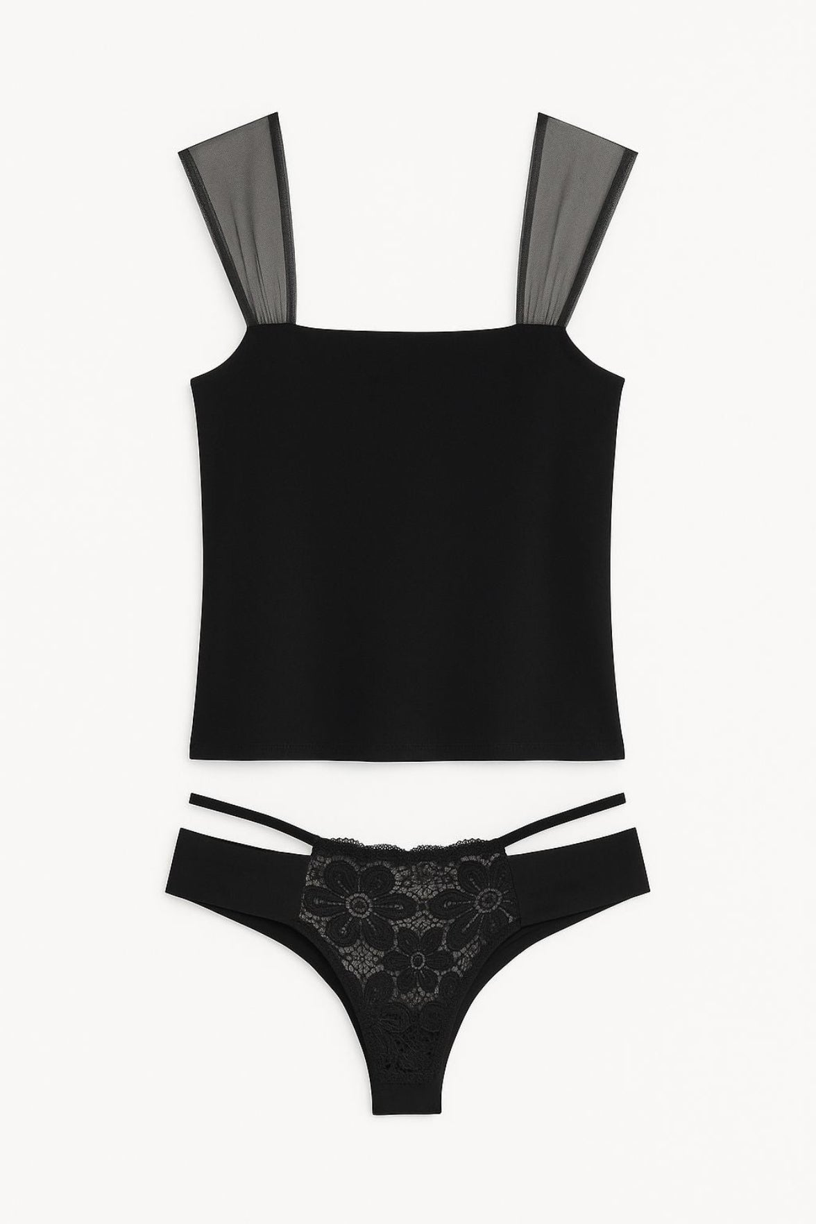 La canotta in morbido bielastico si adatta perfettamente alle forme, mentre le spalline in tulle aggiungono un tocco raffinato e intrigante.