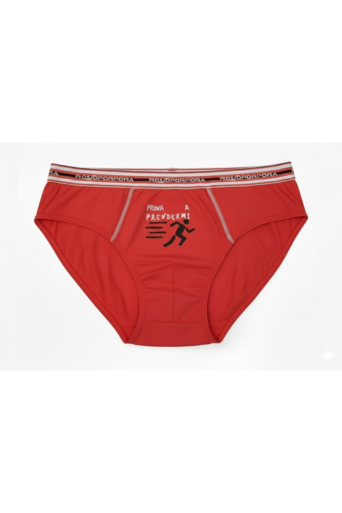 Design: slip rosso con stampa frontale, bordi rossi e cuciture bianche a contrasto, elastico esterno logato con righe bianche e nera