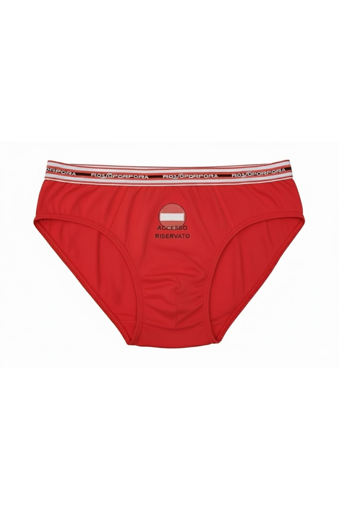 Design: slip rosso con stampa frontale, bordi rossi ed elastico esterno logato con righe bianche e nere