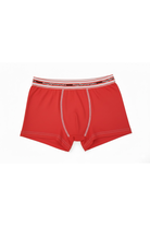 Design: boxer rosso con cuciture a contrasto bianche, elastico esterno logato con righe bianche e nere