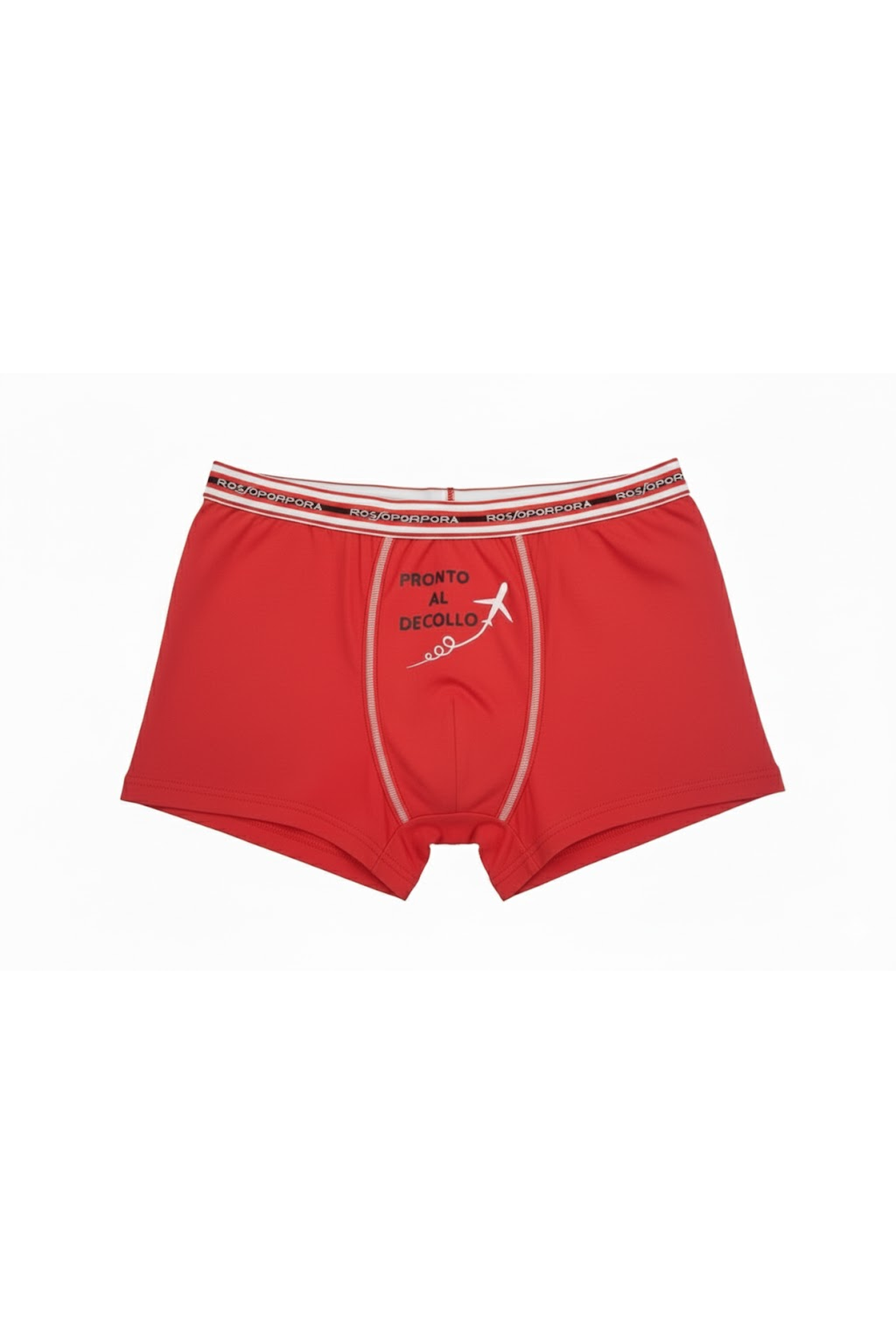 Design: boxer rosso con stampa frontale, bordi rossi e cuciture bianche a contrasto, elastico esterno logato con righe bianche e nere