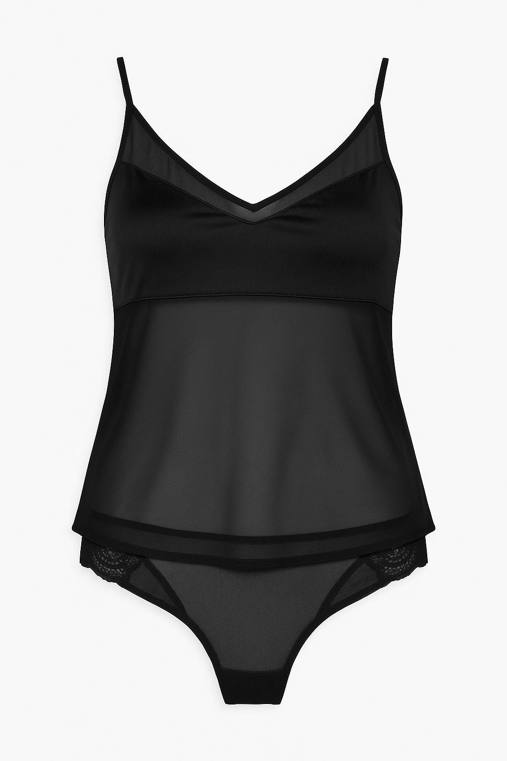 Design: canotta spalla stretta in tulle con fascia centrale in raso, slip a vita alta con inserti in pizzo laterali