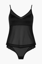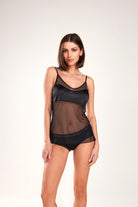La canotta spalla stretta in tulle trasparente accarezza la pelle con leggerezza, mentre la fascia centrale in raso illumina il décolleté con un tocco di charme e femminilità.